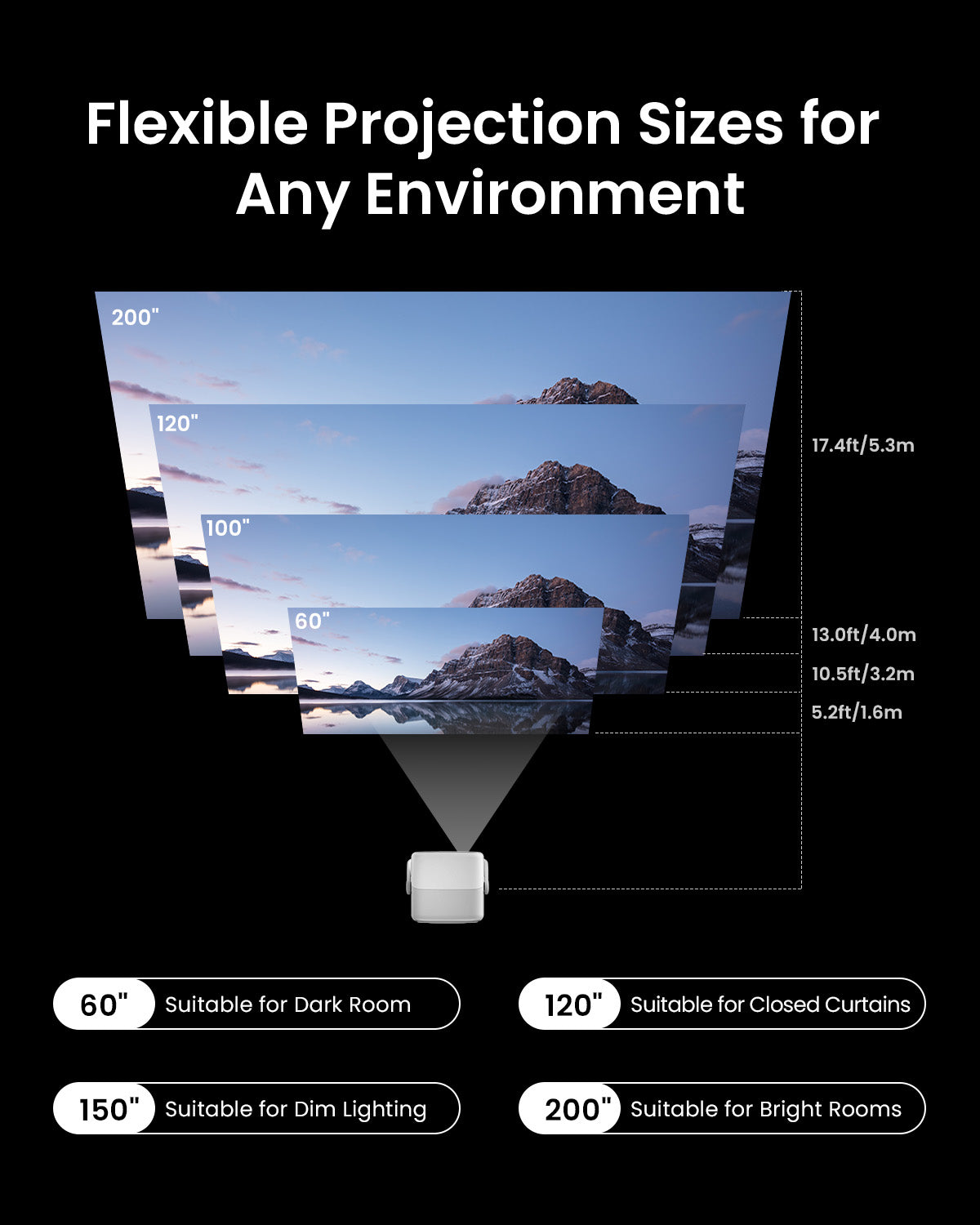 ● Flexible Gimbal for Instant Auto Focus: 127° rotatable gimbal enables effortless projection on any surface, with real-time autofocus, keystone correction, and smart eye protection for clear, safe, and versatile viewing anywhere.