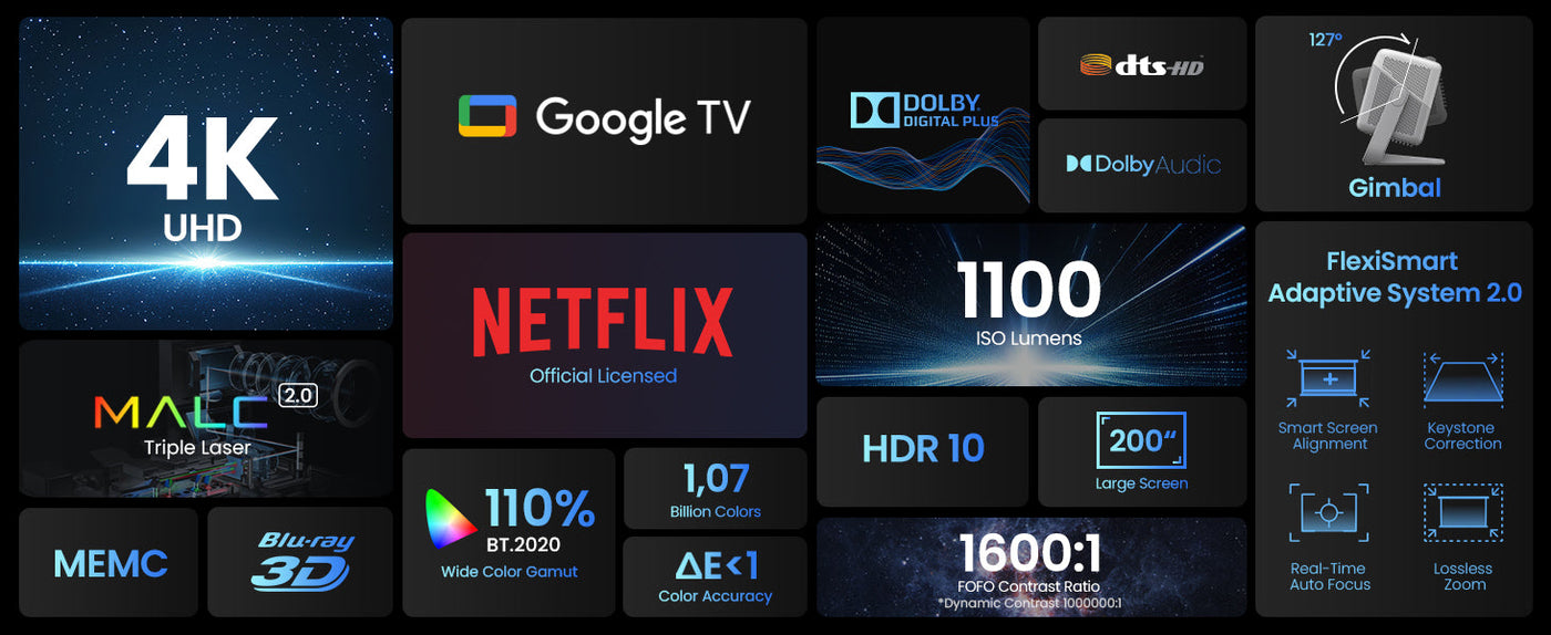 ● Live in Color: Powered by MALC 2.0 triple RGB laser, the N1S 4K delivers ultra-vivid, rainbow-free visuals with 110% BT.2020 color, 1100 ISO lumens, and 1.07 billion colors.
