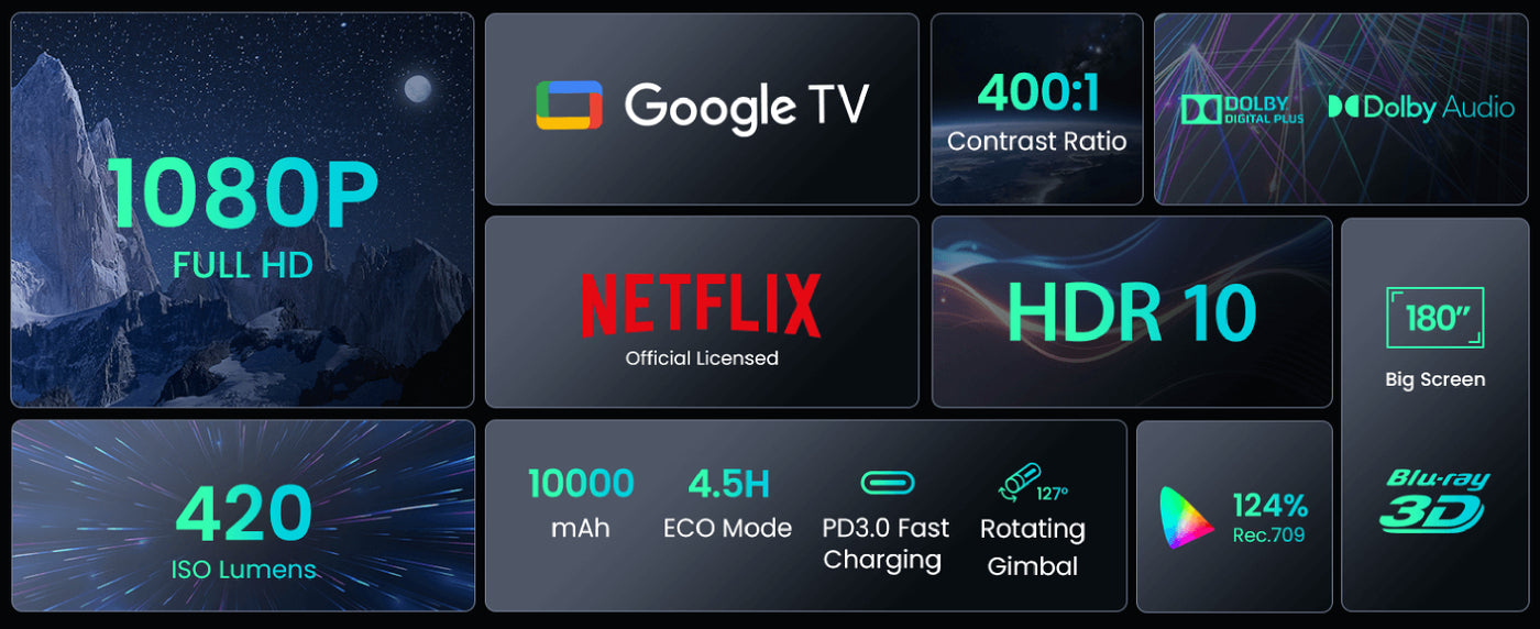 - Stunning Visual Quality: Delivers 420 ISO lumens of brightness, supports HDR10, and features 1080p Full HD resolution for crisp and vivid imagery.