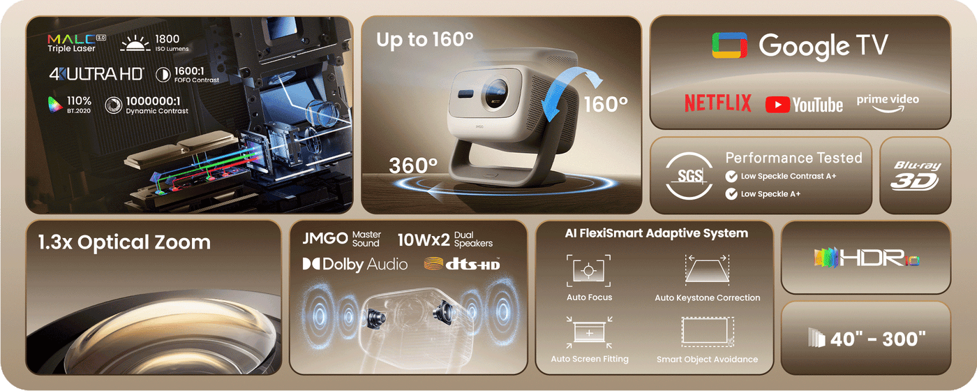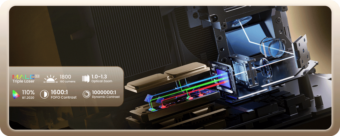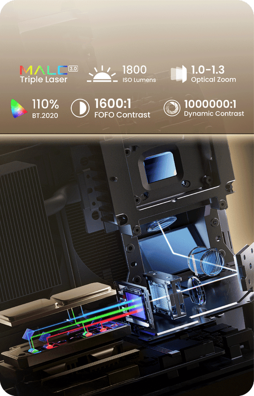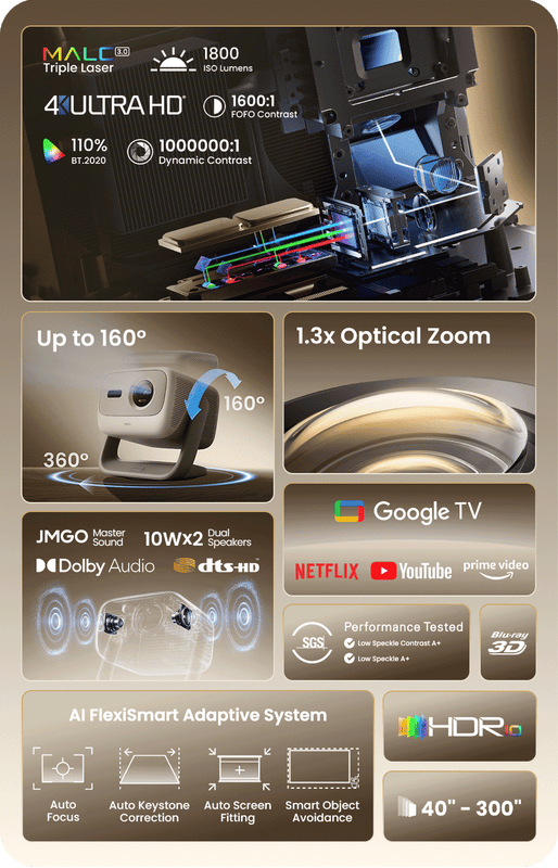 • All-new self-developed MALC 3.0 pure triple laser:Powered by JMGO’s proprietary MALC 3.0 pure triple-laser technology and certified for true 4K, it delivers cinema-level visuals with pure colors and exceptional contrast.