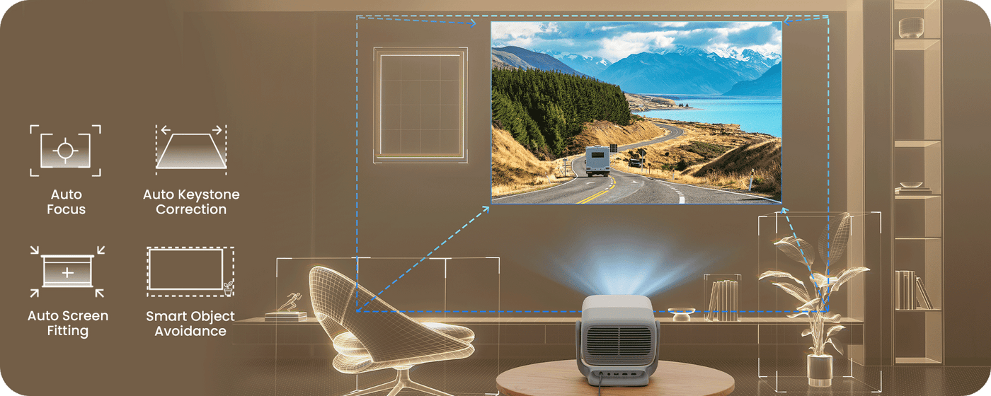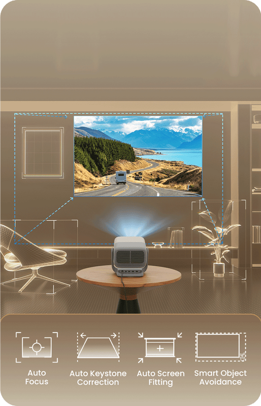 Forget the fuss. With one click, it intelligently scans your space and delivers a perfectly fitted projection with optimal clarity.